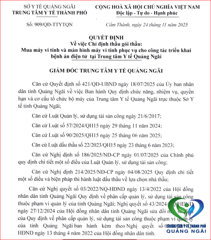 Quyết định về việc Chỉ định thầu gói thầu: Mua máy vi tính và màn hình máy vi tính phục vụ cho công tác triển khai bệnh án điện tử tại Trung tâm Y tế Quảng Ngãi