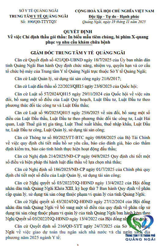 Quyết định chỉ định thầu gói thầu In biểu mẫu tiêm chủng, bì phim X-quang phục vụ nhu cầu khám chữa bệnh.