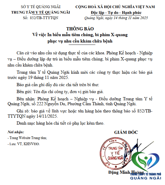 Trung tâm Y tế Quảng Ngãi có nhu cầu về việc In biểu mẫu tiêm chủng, bì phim X-quang phục vụ nhu cầu khám chữa bệnh. Trung tâm Y tế Quảng Ngãi kính mời quý công ty, doanh nghiệp, nhà cung cấp tham gia chào giá theo danh mục mặt hàng theo phụ lục đính kèm thông báo này.