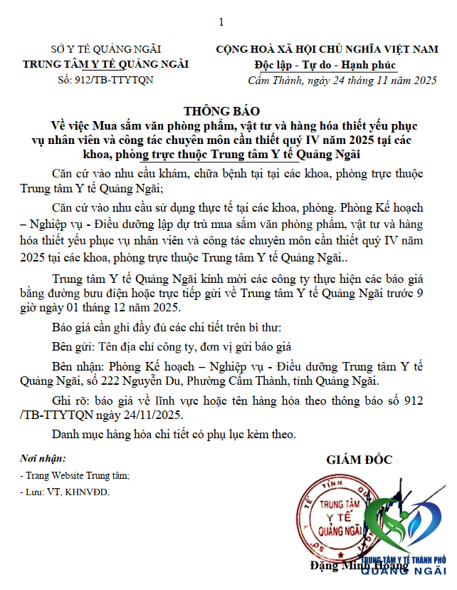 Trung tâm Y tế Quảng Ngãi có nhu cầu về việc Mua sắm văn phòng phẩm, vật tư và hàng hóa thiết yếu phục vụ nhân viên và công tác chuyên môn cần thiết quý IV năm 2025 tại các khoa, phòng trực thuộc Trung tâm Y tế Quảng Ngãi. Trung tâm Y tế Quảng Ngãi kính mời quý công ty, doanh nghiệp, nhà cung cấp tham gia chào giá theo danh mục mặt hàng theo phụ lục đính kèm thông báo này.