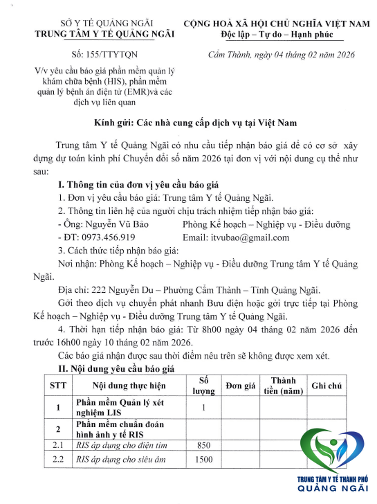 Thư mời chào giá phần mềm quản lý khám chữa bệnh (HIS), phần mềm quản lý bệnh án điện tử (EMR)và các dịch vụ liên quan